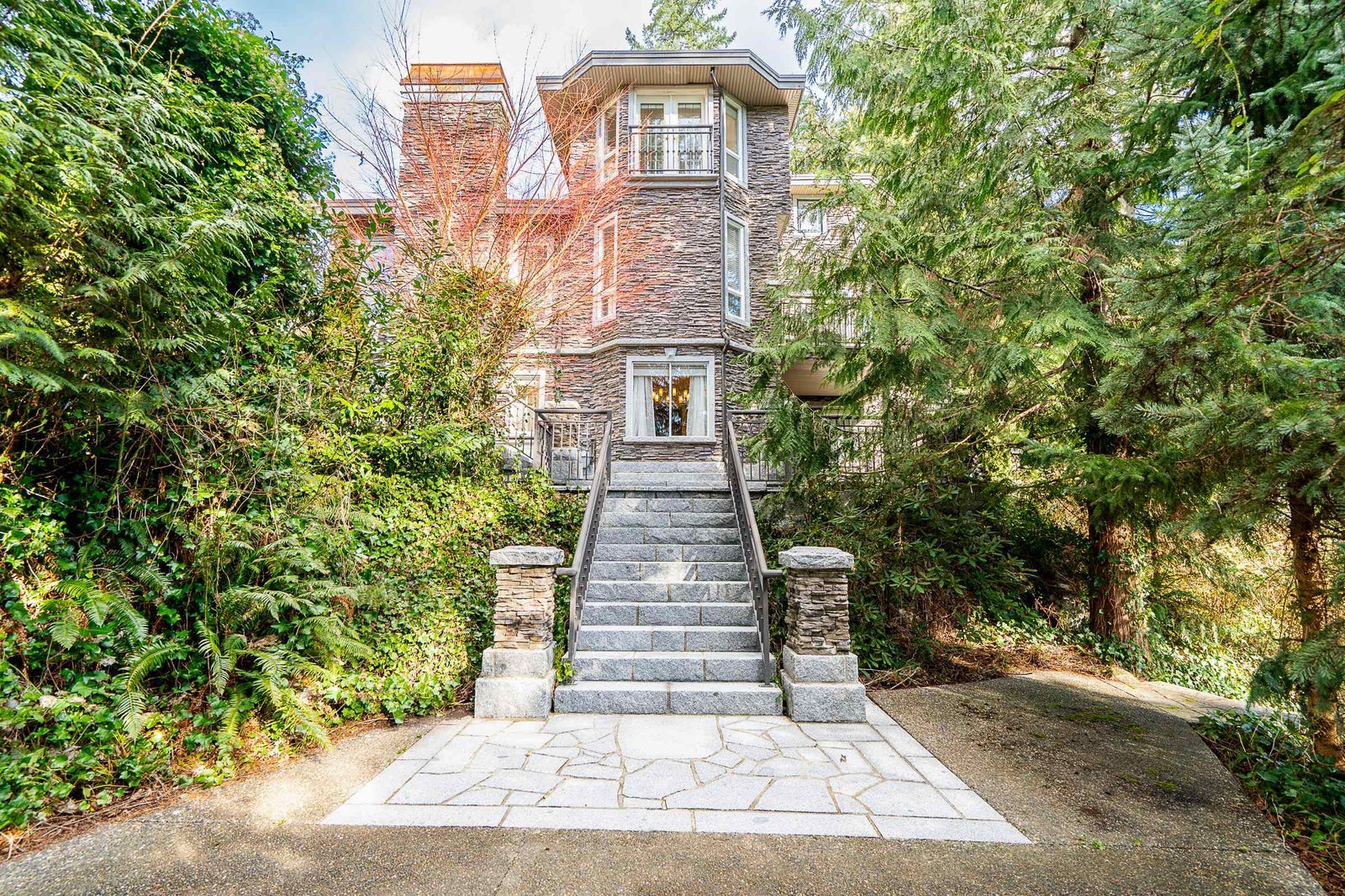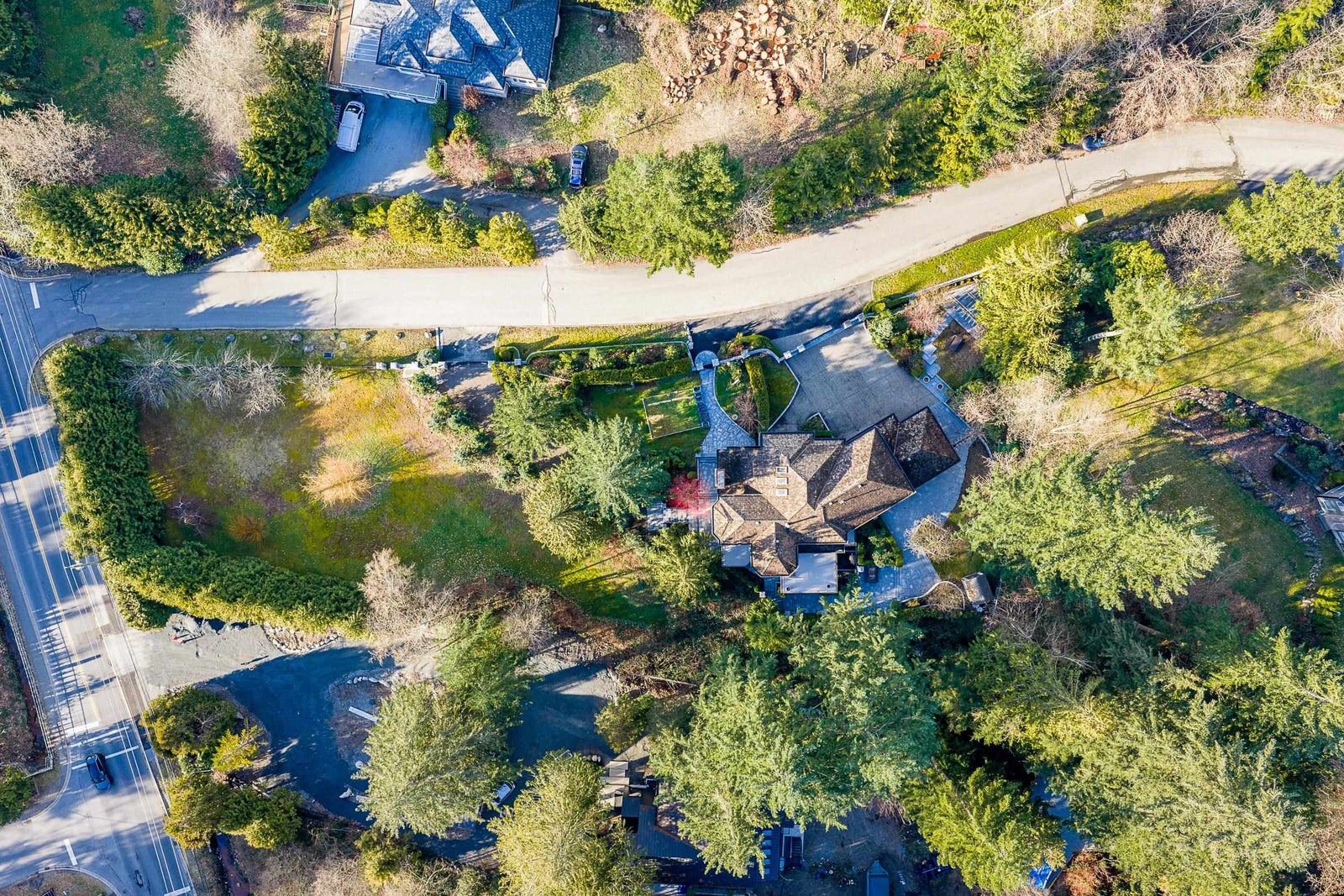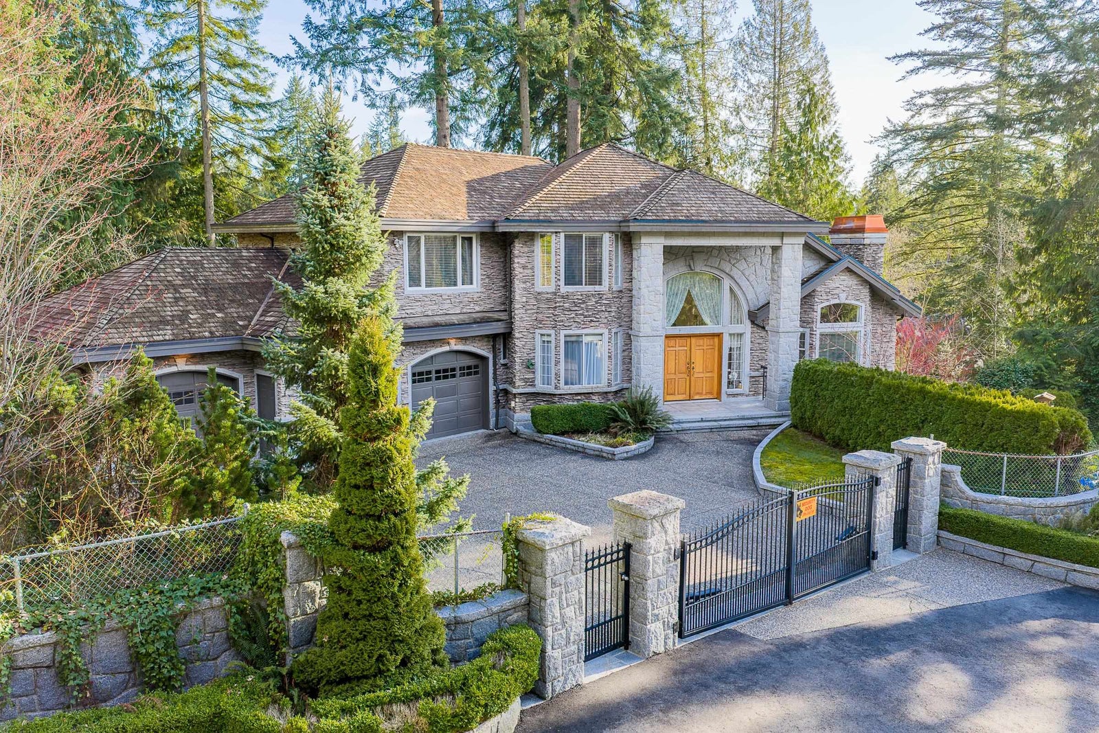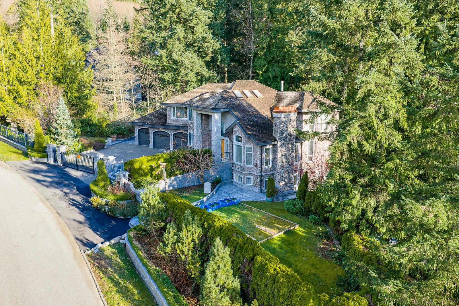 Sophisticated Anmore estate with full one-acre, private lot and SUBDIVISION POTENTIAL. Surrounded by mature landscaping, this residence features an upper and a lower driveway equipped with electric gates for a grand entrance. Step inside to the inviting foyer with beautiful curved staircase, front living room with vaulted ceiling, and a spacious kitchen with access to the large, covered deck, allowing for seamless indoor-outdoor living. A true entertainer’s dream. The main also features a full bathroom and laundry room with second staircase to upper level, where you’ll find 4 large bedrooms and 3 bathrooms including the stunning en-suite. Down offers a spacious suite, full bathroom, media room and outdoor patio. Three car garage and endless opportunities in this beautiful neighbourhood.
